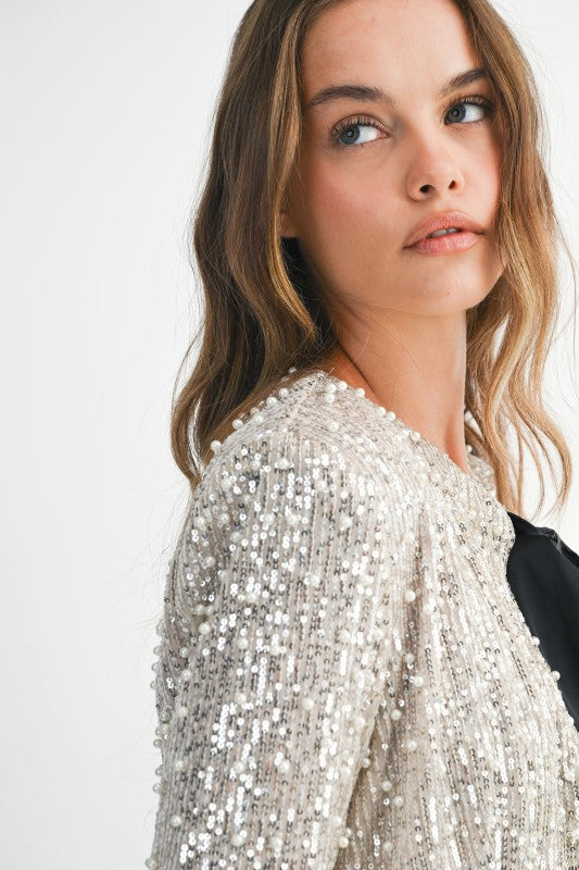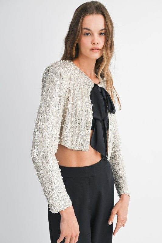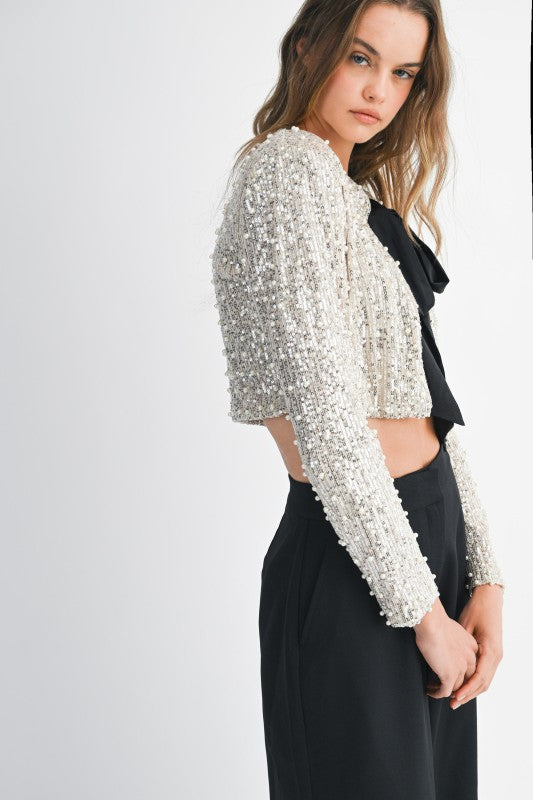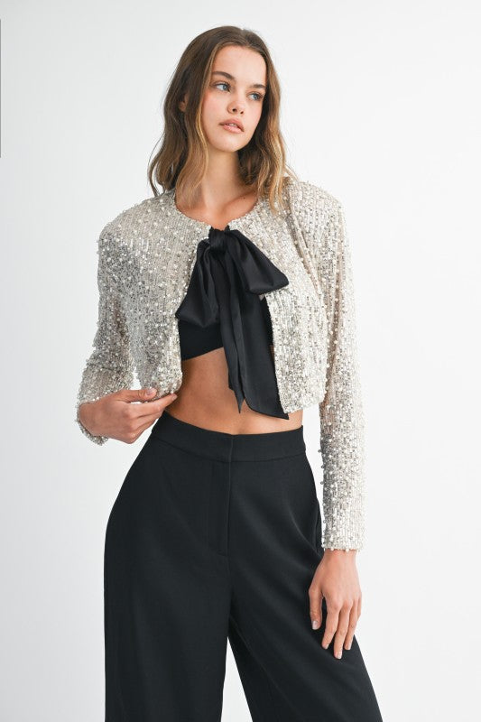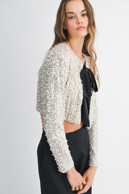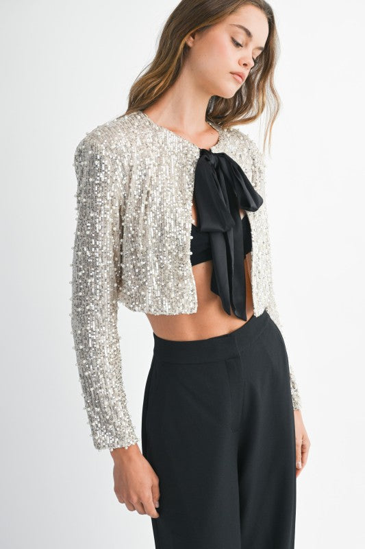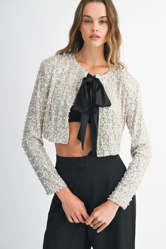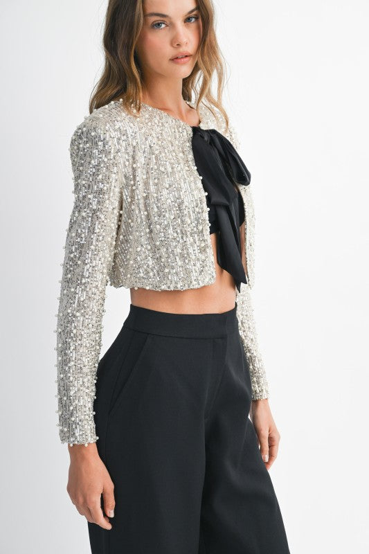Saquito con lentejuelas y perlas con detalle de moño al frente
