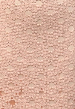 Vestido Midi de encaje con cuello redondo alto, cierre en la espalda y parte del abdomen semidesnudo.